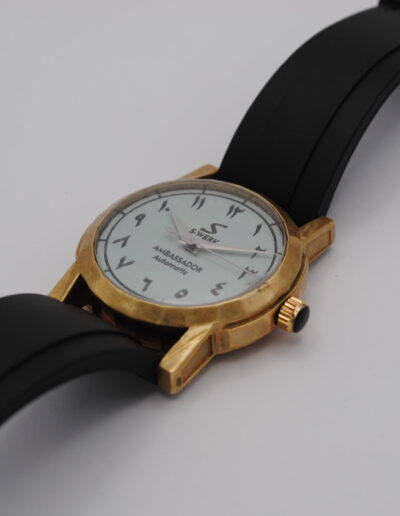 The Ambassador is powered by a self-winding, Swiss, 25-jewell ETA calibre, with a 40h power reserve that ensures your watch keeps ticking while on standby. Each dial is hand-painted with a porcelain composite, with prominently applied numerals that provide maximum visibility from every angle. Protecting the dial is a domed sapphire crystal, scratch resistant and worry-free. Our watches are shock-proof, and moisture resistant, making them suitable for sport and an active lifestyle. The Ambassador model is splash-resistant, but is not waterproof.