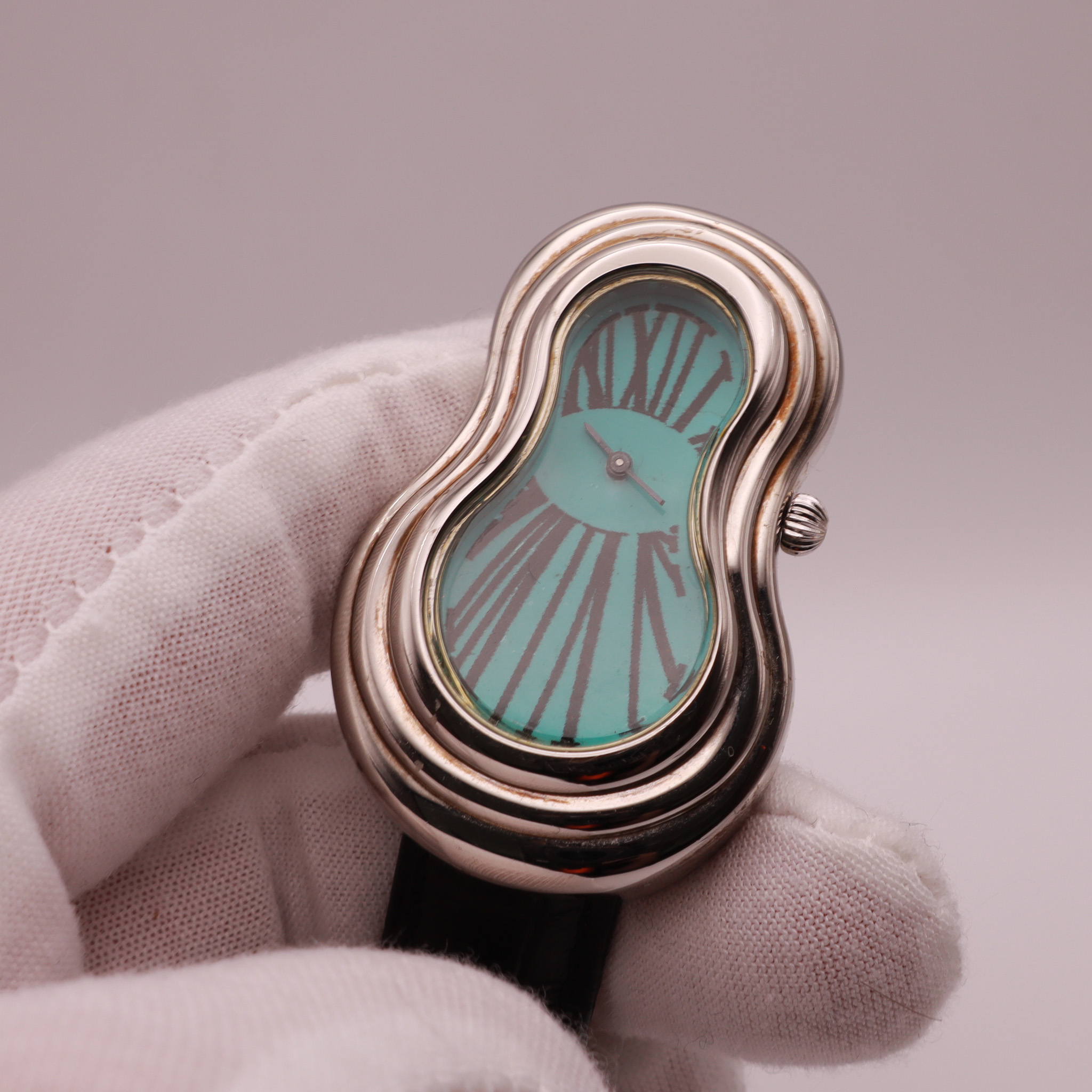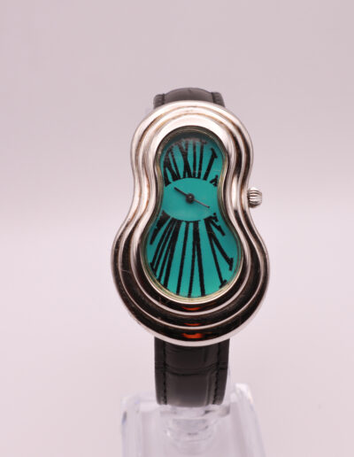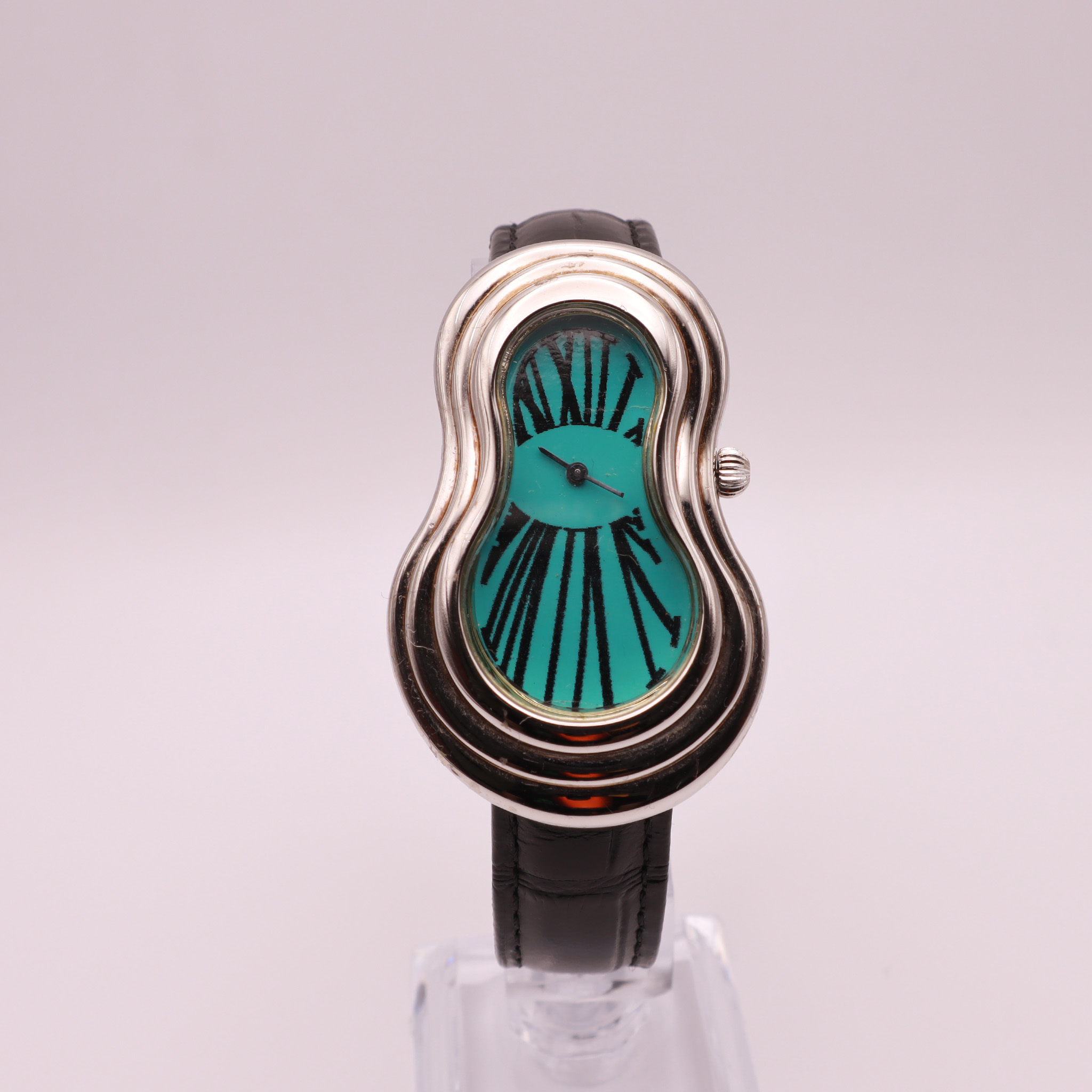 The melting clocks of Salvador Dali’s “Persistence of Memory”, along with many other of Dali’s symbols, were the subject of a controversial licensing deal that produced an array of products ranging from home decor to wristwatches. Notably, Exaequo produced a series of different “softwatch” or “melting watch”-style wristwatches throughout the 1990s and early 2000s, before losing their rights. Originally, they sold as souvenirs, sold through magazines and museum gift shops, often featuring construction that didn’t even lend itself to a battery change. However, with the rise in popularity of asymmetric watch designs such as Cartier’s Crash, interest has returned. Here we have a early 2000’s Salvador Dali Softwatch, produced by Exaequo for DeMart, that we have revived and modified with a new dial and movement.